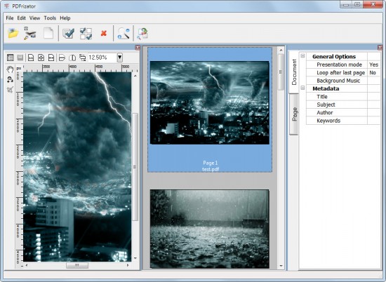 La aplicación gratuita PDFrizator, nos permite crear presentaciones PDF con efectos de transición de página y música de fondo. Esta herramienta totalmente gratuita soporta una gran variedad de formatos, como JPG, GIF o PNG, que pueden ser combinados en la presentación.